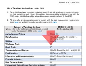 Firms that have been permitted to operate as at 18 Jun will be allowed to continue to carry on their operations post 18 Jun. In addition, firms undertaking activities in line with the SSIC codes listed below will be allowed to resume operations from 19 Jun 2020.